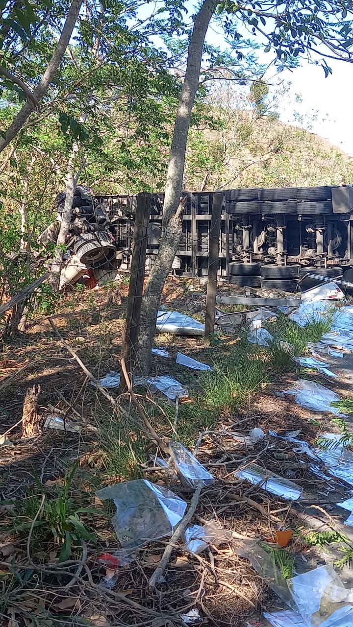 Uma carreta carregada de roupas se envolveu em um acidente com um caminhão. Com o impacto, o veículo tombou às margens da rodovia e parte da carga se espalhou.