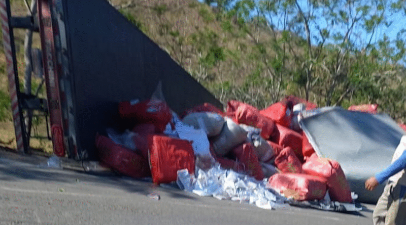 Carreta carregada de roupas tomba após colisão em Itaperuna