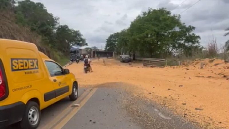 Uma carreta bitrem carregada com cerca de 10 toneladas de milho tombou na tarde desta quarta-feira (15) na Rodovia BR-356, nas proximidades do trevo de acesso a Bom Jesus do Itabapoana, em Itaperuna.