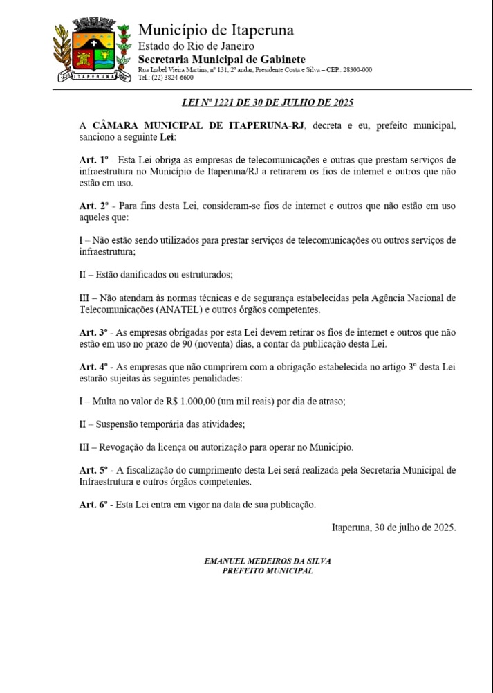O prefeito de Itaperuna, Emanuel Medeiros da Silva, o Nel, sancionou uma lei que obriga as empresas de telecomunicações e demais prestadoras de serviços de infraestrutura no município a removerem fios soltos.