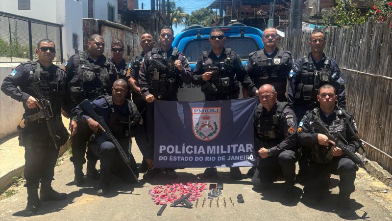 Policiais militares cumpriram mandado judicial no Morro do Querosene, Beco do Zumbi, em Laje do Muriaé, nesta quinta-feira (20). Durante a ação, três suspeitos foram localizados e abordados, resultando na apreensão de uma pistola da marca Taurus de calibre .45, 23 munições intactas, dois carregadores (um deles alongado), 88 pinos de cocaína, um carregador portátil e três celulares.